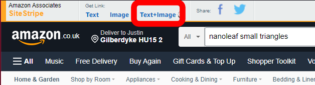 Once you have found a product, and opened its page, look at the very top of the screen and you will see a tool bar with ‘SiteStripe‘ on the far left. Click the option that says ‘Text+ Image‘, and then press Ctrl+C to copy the code that appears.