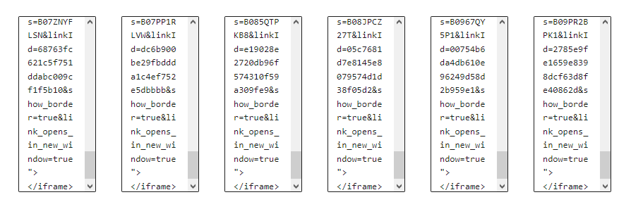 You should aim to have all six columns filled with code, so that you have six Amazon products listed.
